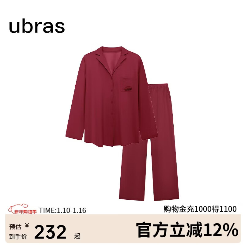 ubras云棉草本经典开襟软棉棉家居服女士情侣睡衣套装云朵丝绒红色L