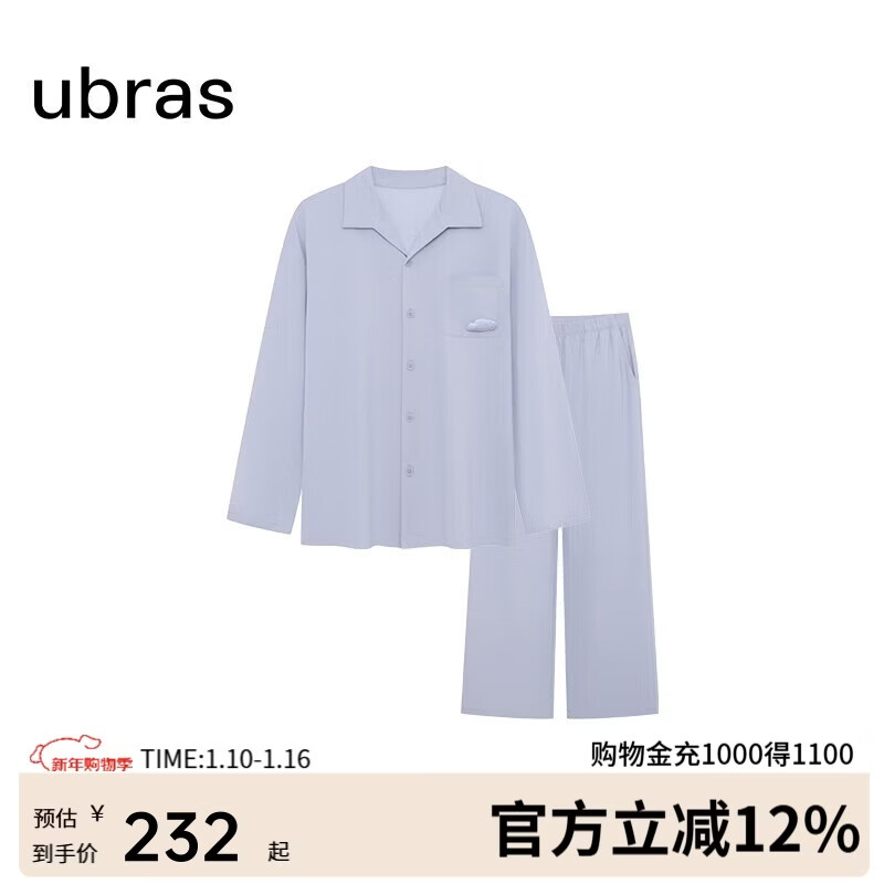 ubras云棉草本经典开襟软棉棉家居服男士情侣睡衣套装奶盐蓝色XL