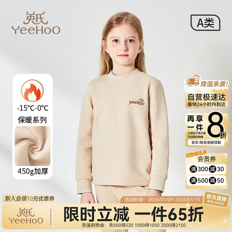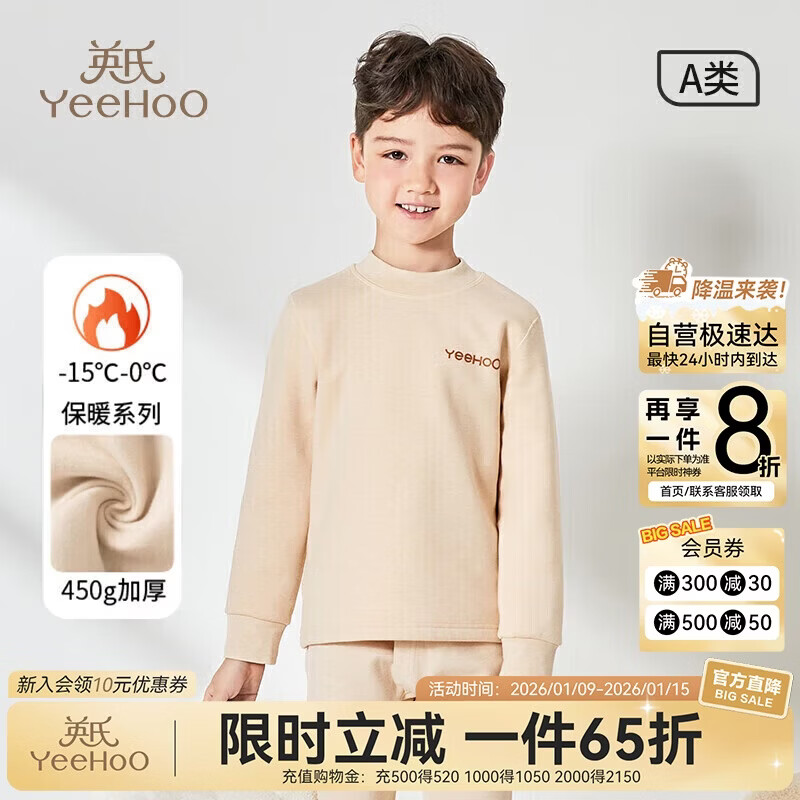 英氏(YEEHOO)儿童保暖内衣套装秋冬天然彩棉打底加绒加厚男女童中大童套装