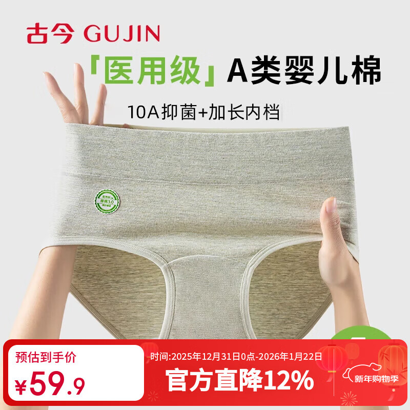 古今(GUJIN)4条装女士内裤女【10A医用级原棉】彩棉加长裆中高腰收腹三角裤hy