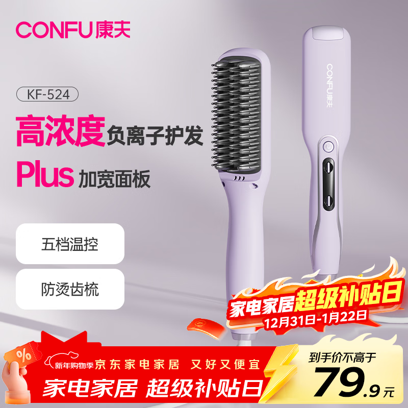 康夫(CONFU)直发梳卷发棒卷直发器负离子造型梳礼物卷直两用便携拉直内发梳子懒人电卷梳KF-524紫
