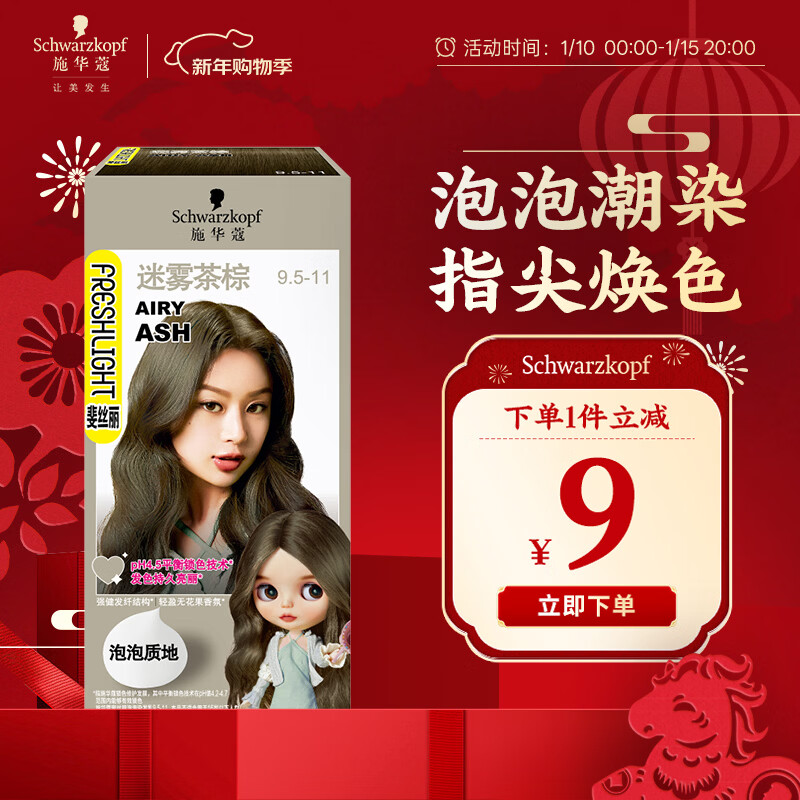 施华蔻(Schwarzkopf)斐丝丽泡泡染发剂9.5-11迷雾茶棕 染发膏自己染染发泡泡潮流彩染