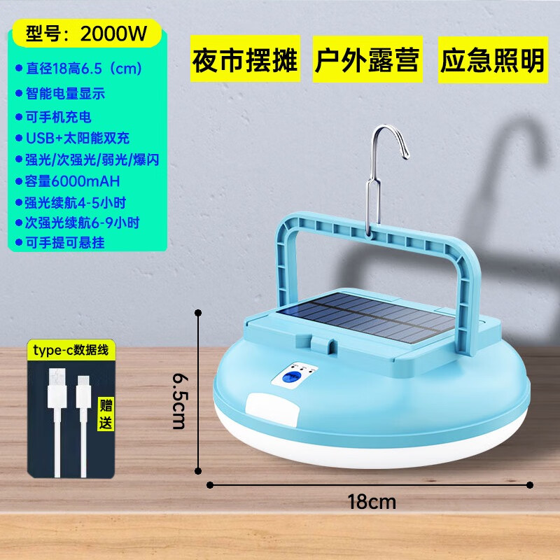 无瑕摆摊夜市灯太阳能充电照明灯露营灯超长续航超亮led应急地摊灯 浅蓝色2000W可充手机