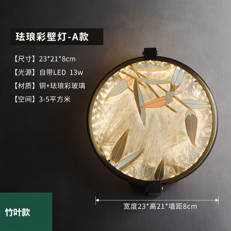 无瑕轻奢珐琅彩壁灯新中式客厅电视沙发背景墙灯全铜过道卧室床头灯具 竹叶款-全铜+珐琅彩(默认暖光) 13W