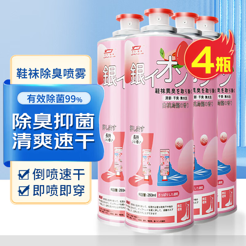 杜尔.德澳鞋子除臭喷雾鞋袜除臭喷剂球鞋脚臭银离子运动篮球鞋汗脚防臭去味 白桃味除臭喷雾4瓶装