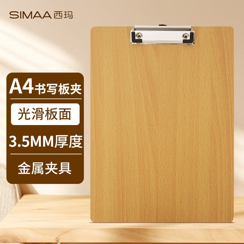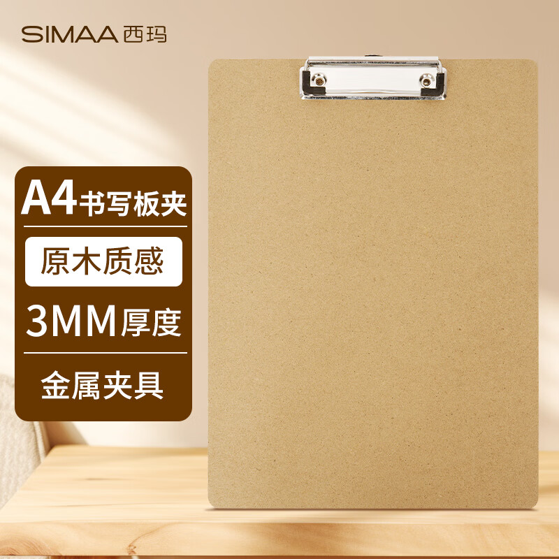 西玛(SIMAA)A4原木质感书写文件夹板夹 写字垫板金属强力夹写字板夹垫板试卷资料收纳夹加厚款 棕色19413