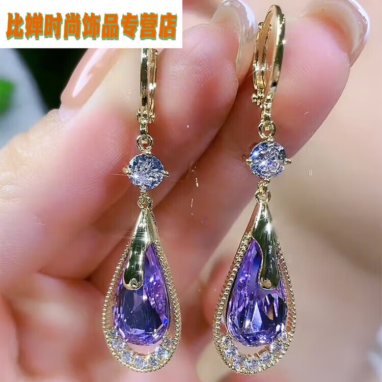 buhesyt感紫色水晶水滴形耳环简约大气耳扣时尚气质耳饰2024年新款潮 紫色水滴耳环