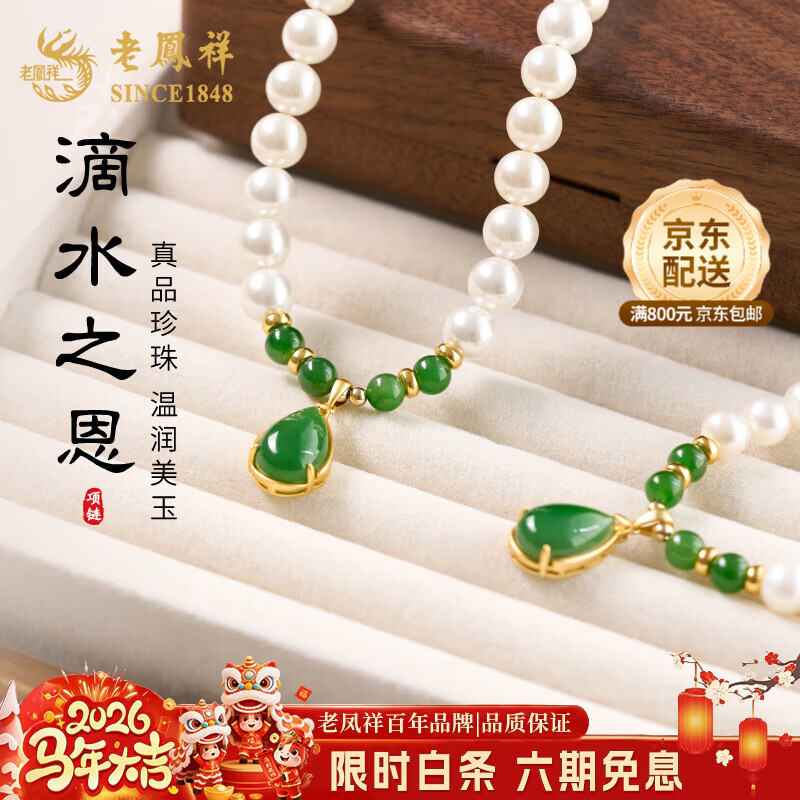 老凤祥珍珠项链女和田碧玉水滴形淡水珍珠吊坠母亲节生日礼物送老婆妈妈 和田碧玉珍珠项链【5-6mm金色-品牌礼盒】