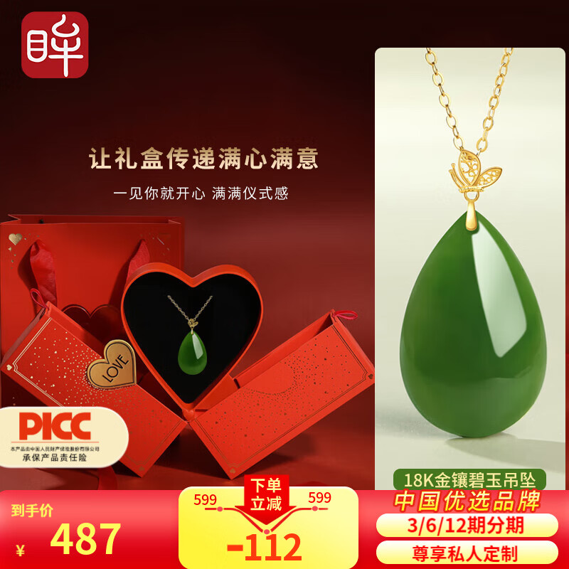 印象眸金镶玉吊坠和田玉水滴女款18K金蝴蝶心形礼盒红色 碧玉-翩翩起舞