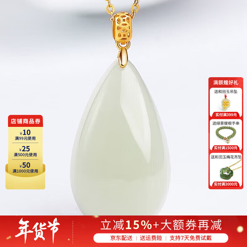 周六福水滴形和田玉吊坠黄金镶玉坠生日礼物AAYB042684 不含链