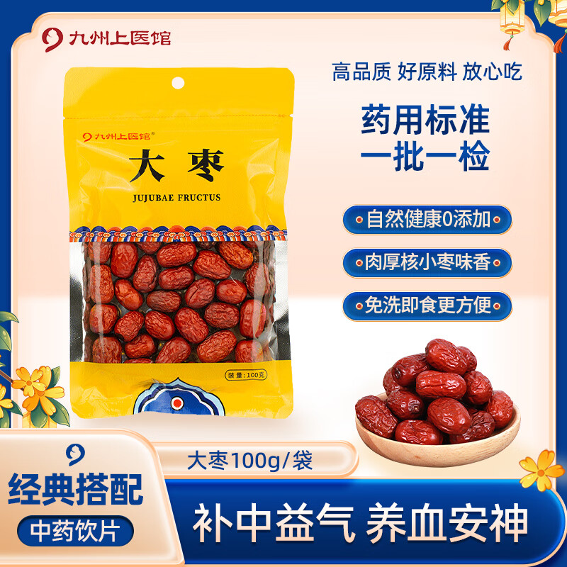 九州上医馆 大枣100g/袋中药饮片九州通饮片 红枣个头小而甜 泡水煲汤药枣中药材 补中益气养血安神 大枣100g/袋【药典标准】