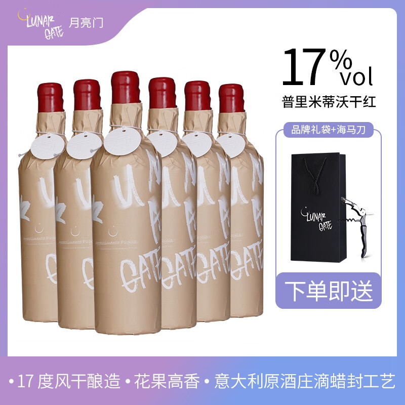 LUNAR GATE意大利进口普里米蒂沃干红葡萄酒750ml 传统风干酿造17度原厂蜡封 750ml*6瓶