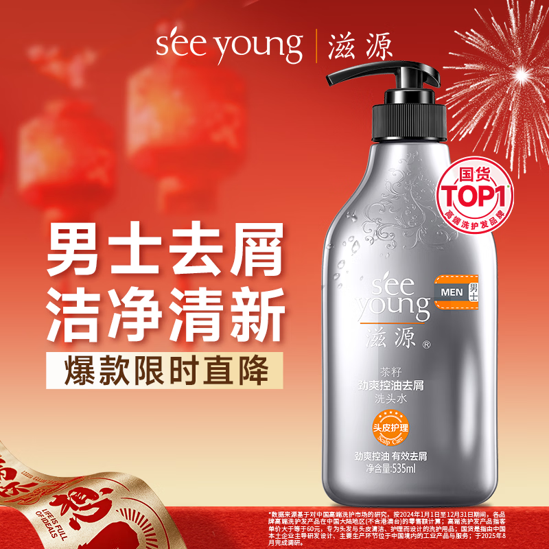 滋源洗发水男士茶籽劲爽控油去屑洗头水 无硅油清爽蓬松洗发液535ml