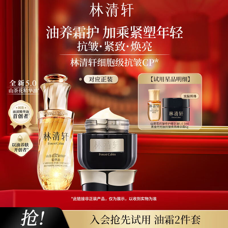 林清轩山茶花精华油时光抗皱淡纹紧致面霜护肤套装元旦礼物送女友送男友 5.0油3ml+2.0黑金霜6ml