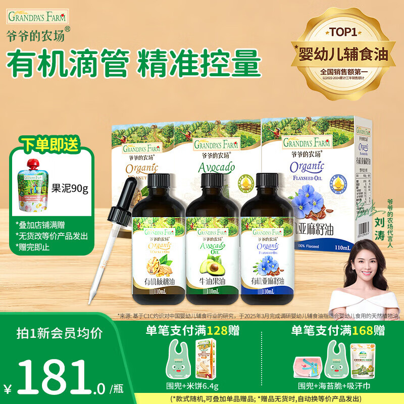爷爷的农场有机辅食油儿童冷榨热炒核桃油滴管110ml 宝宝营养添加食用油 110ml组合装-核桃油+牛油果油+亚麻籽油