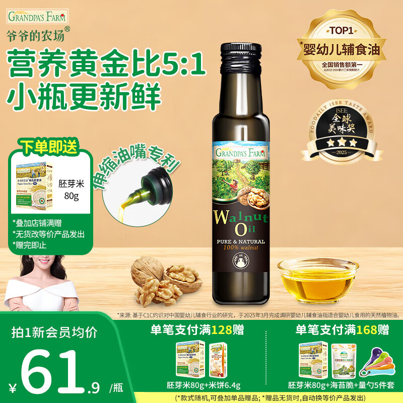 爷爷的农场儿童辅食油 DHA营养添加滴管 儿童冷榨热炒进口宝宝食用油 【国标一级】进口核桃油100ml
