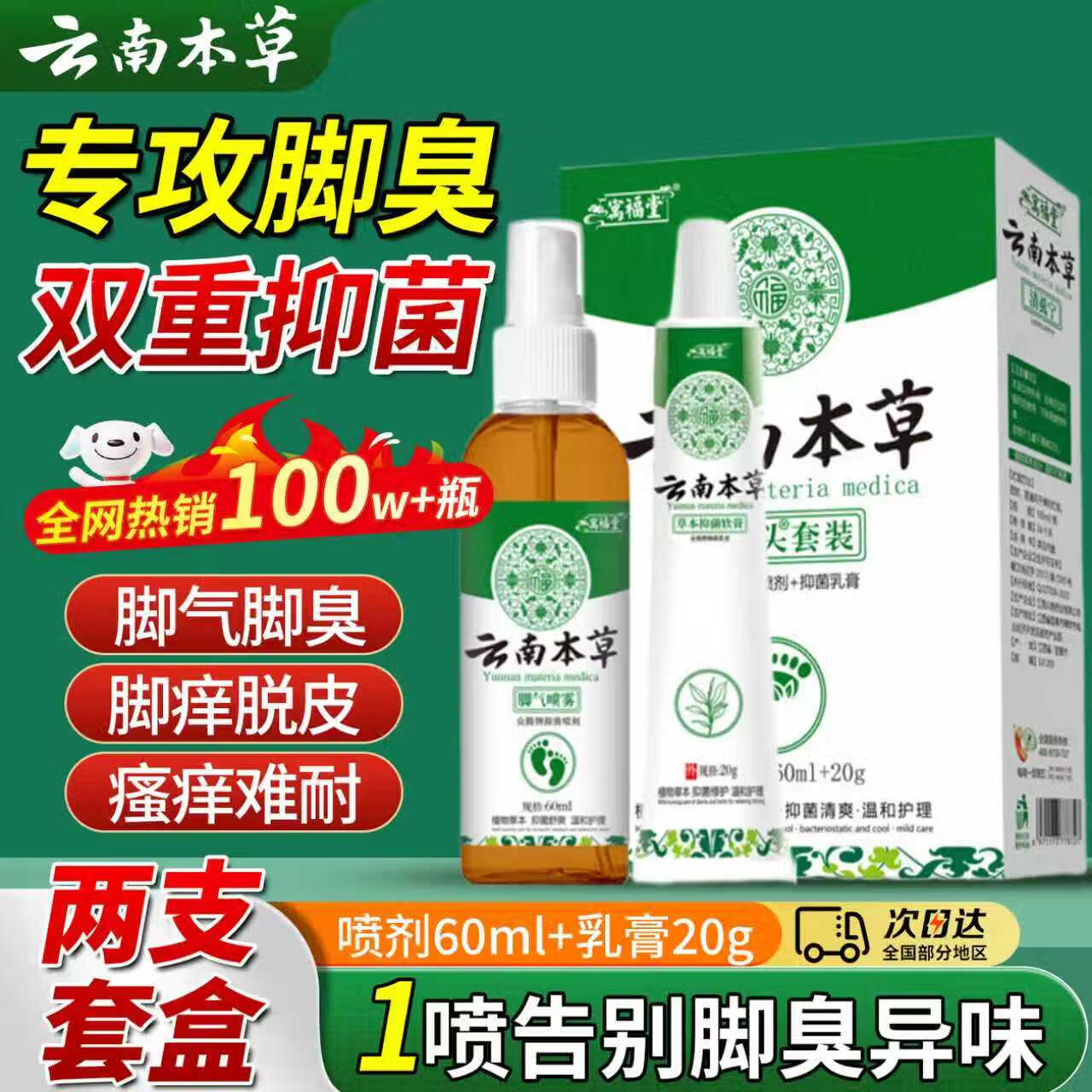 云南本草狼毒脚汽喷剂止痒脱皮杀真菌脚臭水泡烂脚丫脚汗足部清爽 绿色 1盒装