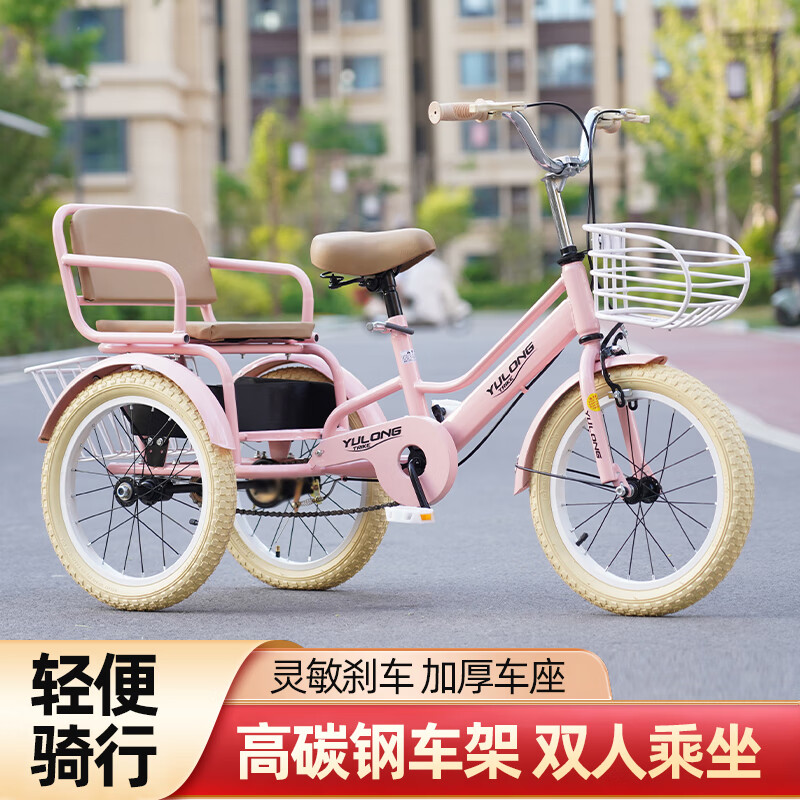 玉龙儿童三轮车亲子车3-11岁踏步车双人骑行安全双刹便载人自行车 桃粉色 单速 16英寸(95-115)