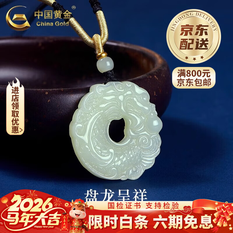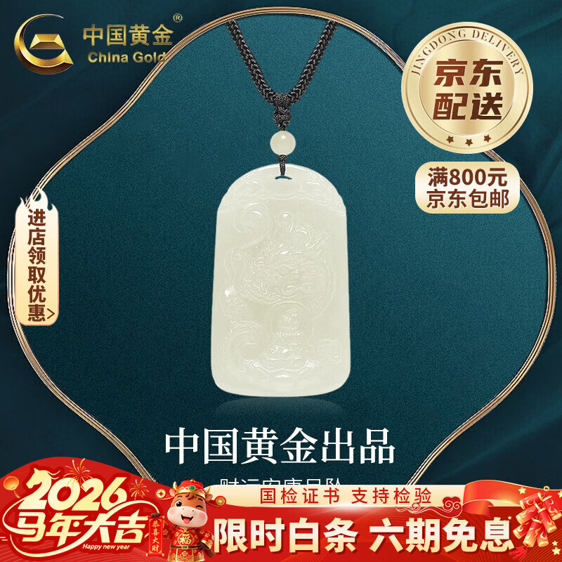 中国黄金(CHINA GOLD)和田玉玉龙牌吊坠男玉石项链挂坠高级感情生日礼物马年本命年礼物 和田玉玉龙牌项绳【品牌礼盒】