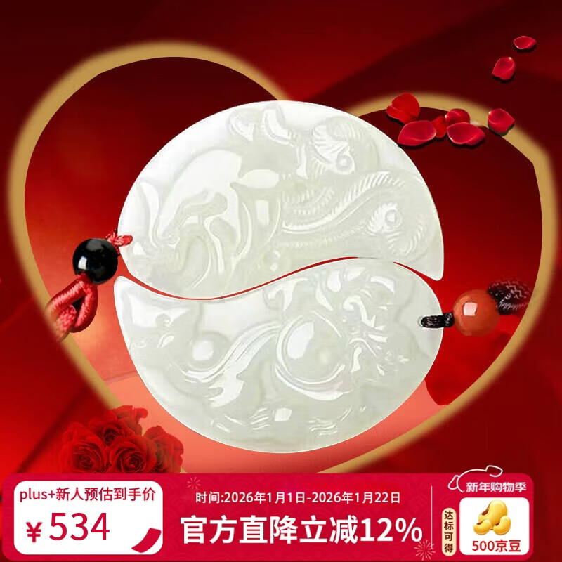 千琢和田玉龙吊坠龙凤呈祥牌玉坠男款石男女士情侣520送男朋友礼物 龙凤呈祥
