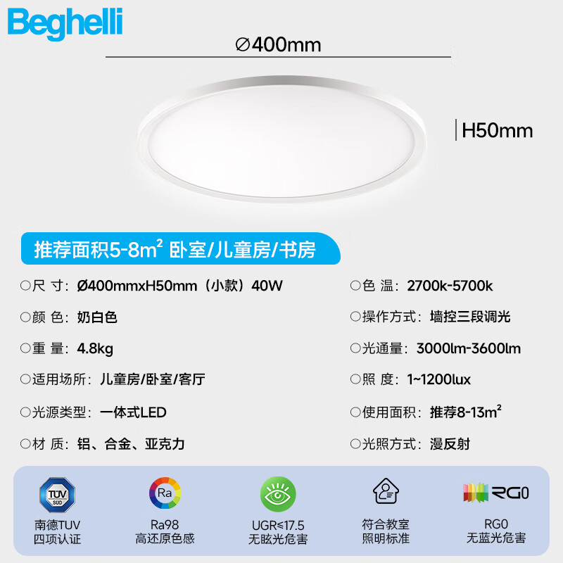 BEGHELLI百家丽卧室护眼吸顶灯儿童房书房学习LED全光谱吸顶灯现代简约款 40W 光视界(悦眼系列)