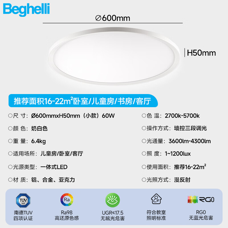 BEGHELLI百家丽卧室护眼吸顶灯儿童房书房学习LED全光谱吸顶灯现代简约款 60W 光视界(悦眼系列)