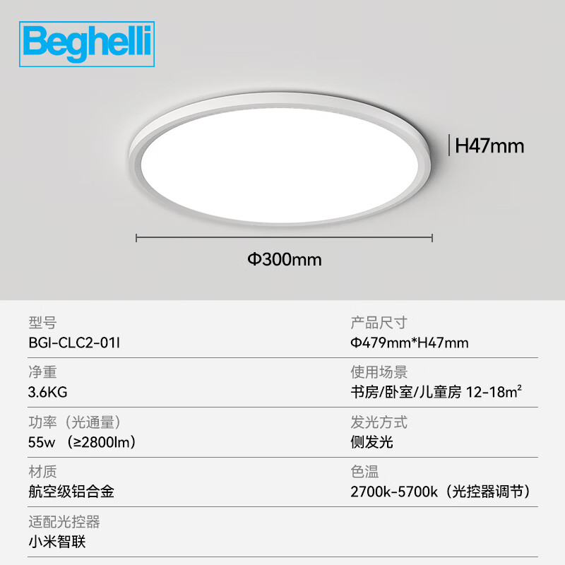 BEGHELLI百家丽卧室护眼吸顶灯儿童房书房学习LED全光谱吸顶灯现代简约款 55W 18㎡内适用 4100lm 支持小米智联