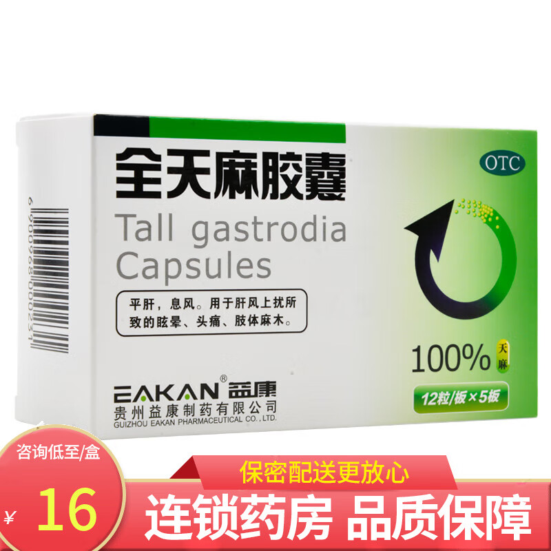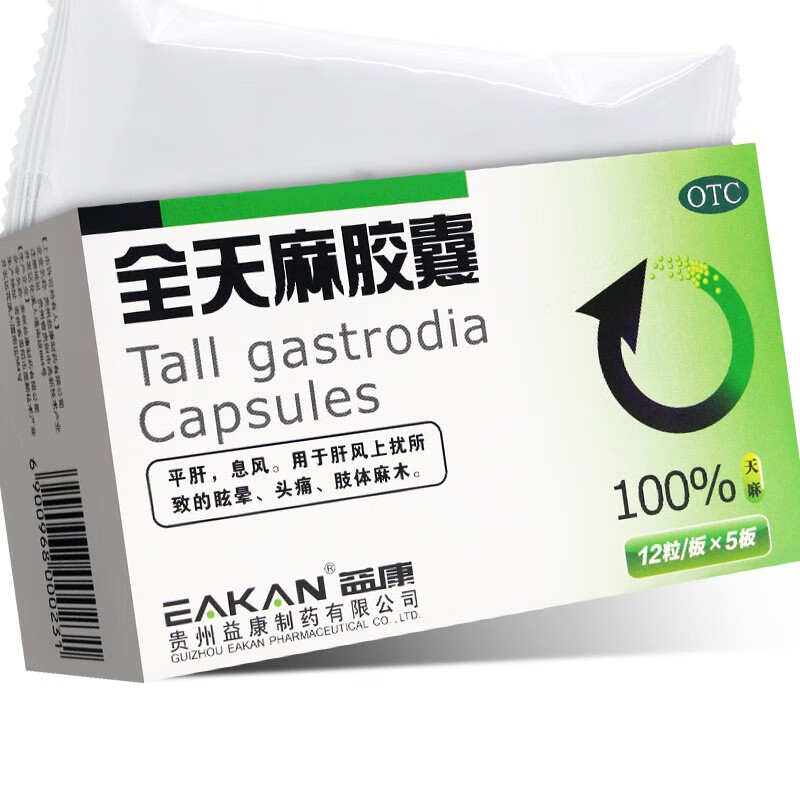 60粒大规格】益康 全天麻胶囊 60粒 肝风上扰所致眩晕头痛肢体麻木 贵州益康 OTC W 3盒