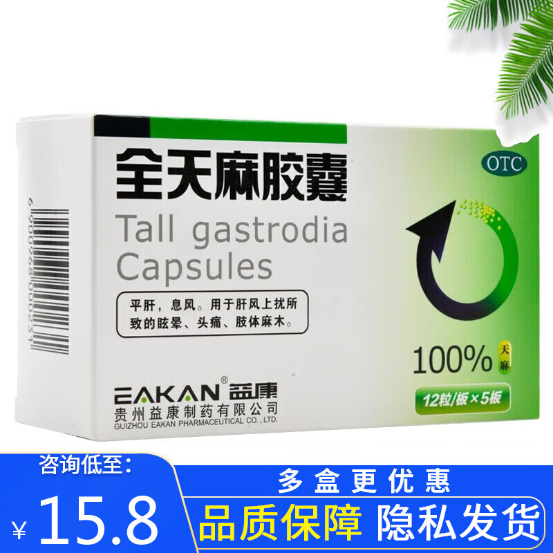 [益康]全天麻胶囊 0.5g*60粒 5盒装 60粒 平肝息风用于肝风上扰所致的眩晕头痛肢体麻木 咨询15.8/盒