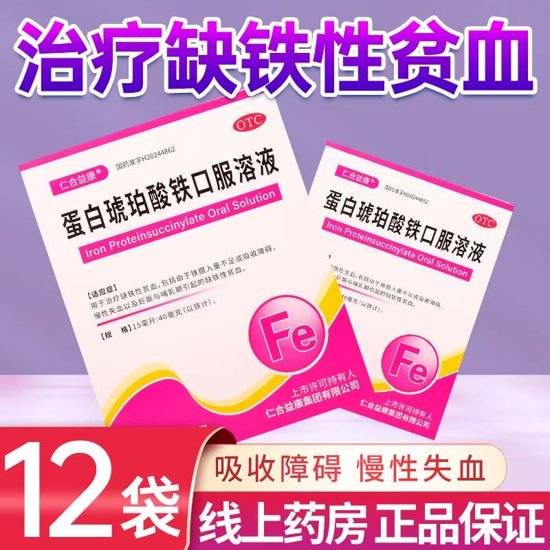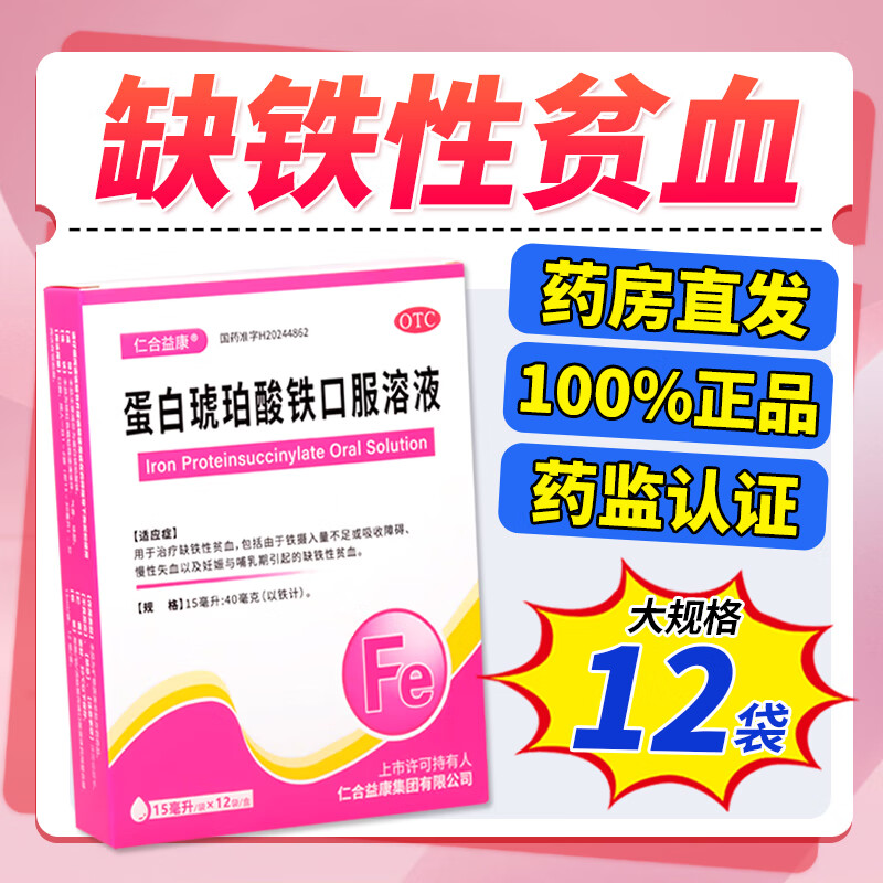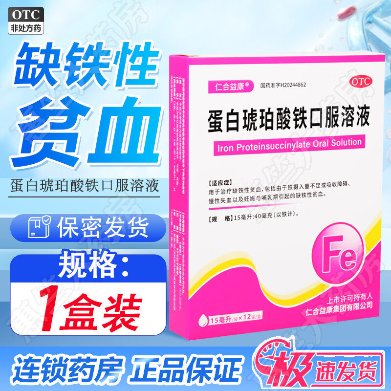 [仁合益康]蛋白琥珀酸铁口服溶液 15ml*12袋 1盒装 儿童成人孕妇婴儿治疗缺铁性贫血妊娠哺乳期国药准字补血补铁改善贫血 3盒低至88/盒