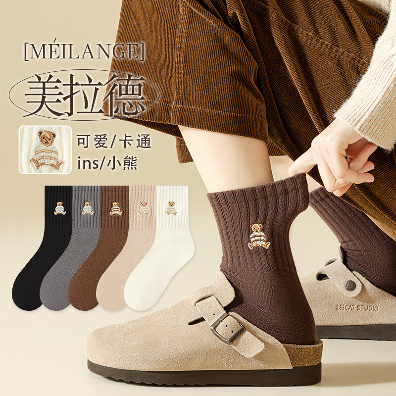 宜而爽袜子女中筒袜秋冬款日系可爱小熊提花堆堆袜显瘦百搭长筒袜 【10双】棕色4 卡其3 白色3 均码