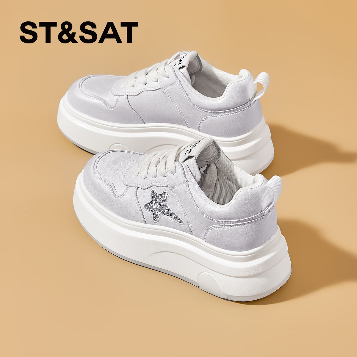 星期六2025春季新款厚底小白鞋百搭星星系带时尚女鞋休闲运动板鞋 银色 35