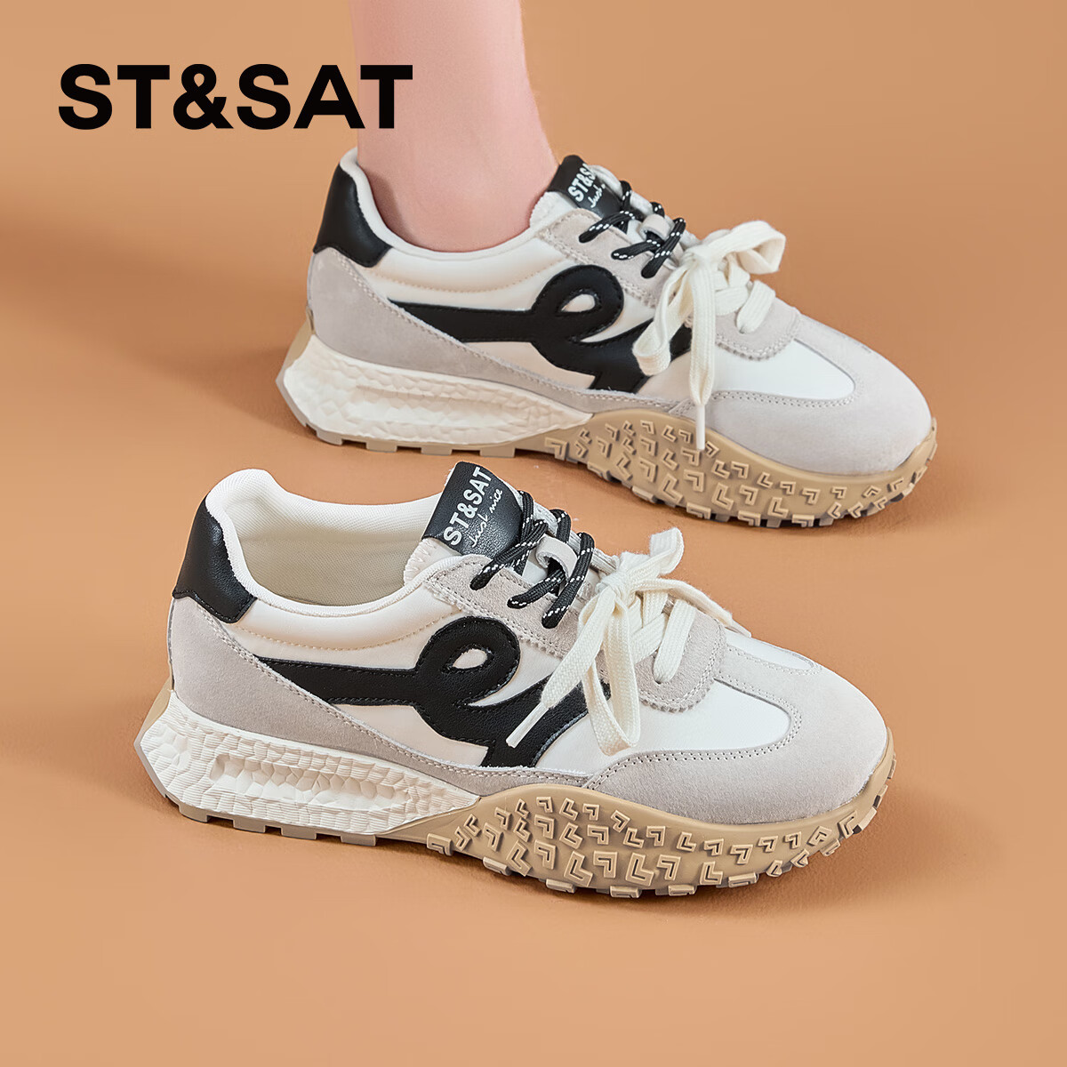 星期六厚底德训鞋女2025春季新款休闲运动鞋复古双系带阿甘单鞋女款 米/黑 35