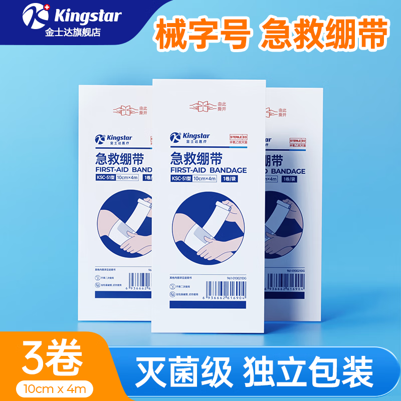 金士达医用急救绷带伤口包扎固定止血敷料自带敷布透气弹力绷带灭菌级 10cm*400cm—急救绷带3卷