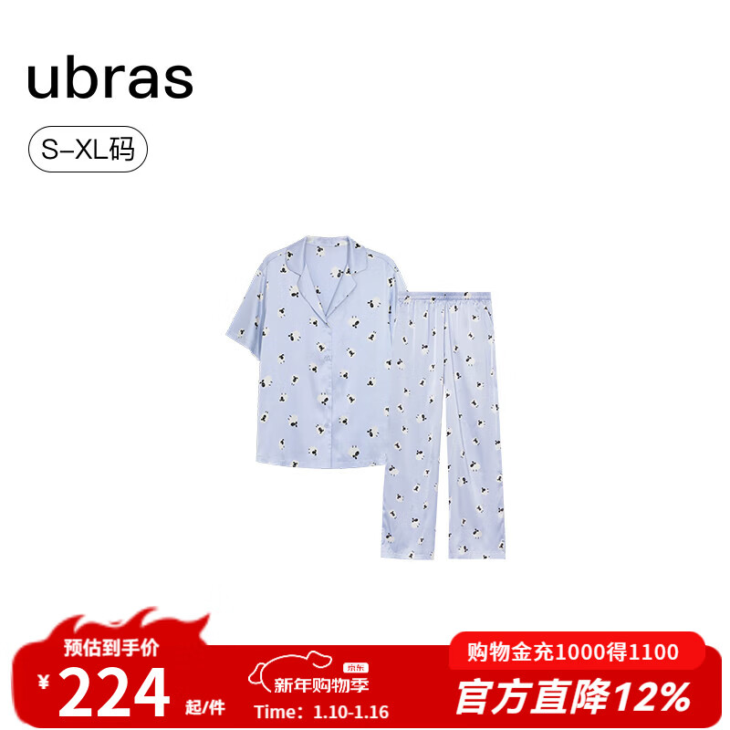 ubras25年新品睡衣女流光出游情侣家居服7A抗菌缎面带胸垫男 【不带杯】短袖长裤女-发呆小羊 蓝 M