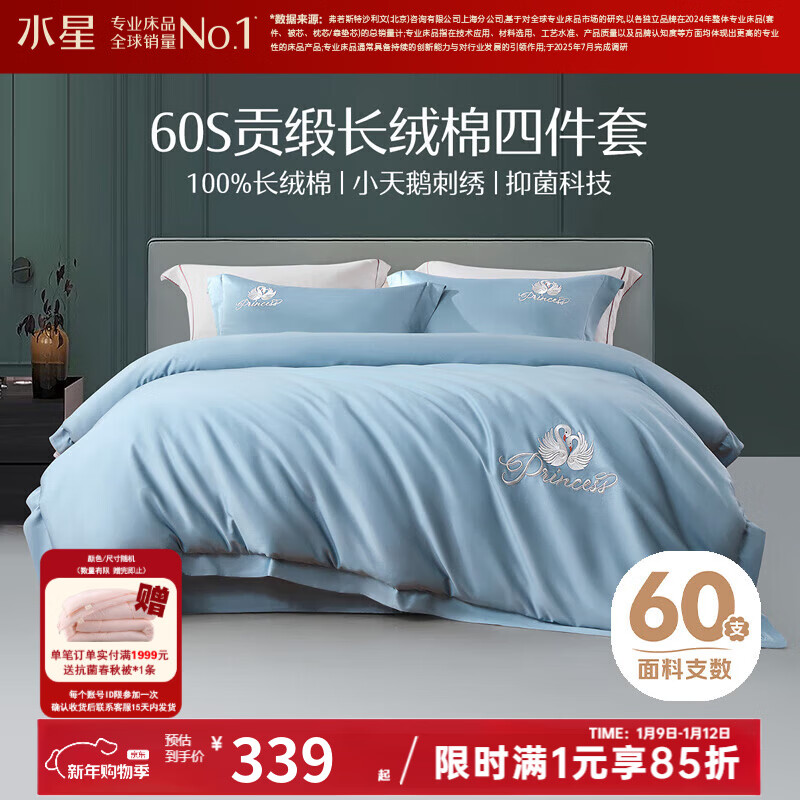 水星家纺床上四件套 60支新疆长绒棉贡缎面料 酒店轻奢床品 被套床单枕套 梦之天鹅(灰蓝色/抑菌) 1.8m床 床单款 (被套220*240cm)