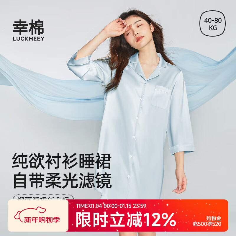 幸棉【断码特惠】睡衣女款缎面小翻领家居服丝滑居家女士衬衫睡裙薄 爱若蓝 S (80-110斤)