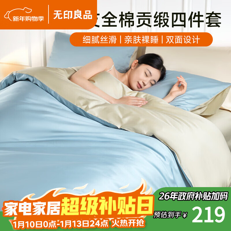无印良品A类100%纯棉60支超柔贡缎面亲肤四件套全棉床上用品轻奢被套床单双人1.5/1.8米床2*2.3m