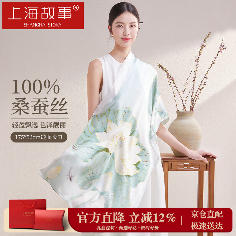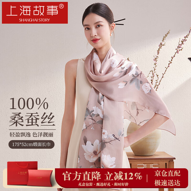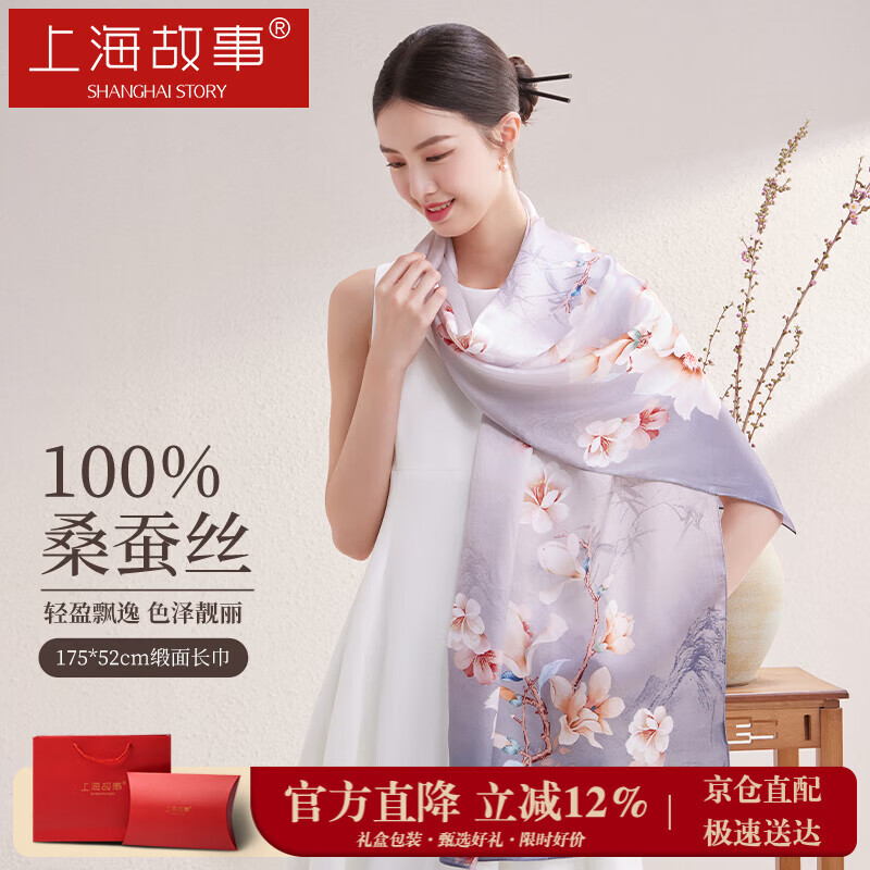 上海故事真丝丝巾女士100%桑蚕丝绸缎面围巾礼盒送长辈妈妈生日礼物节日
