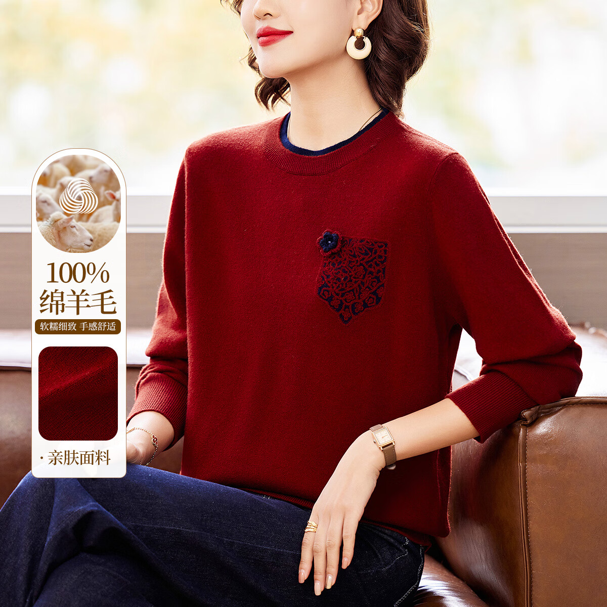 卡汶(KAVON)【100%绵羊毛】国风立体缕空绣花毛衣2025款高级感针织衫 锈红 XL
