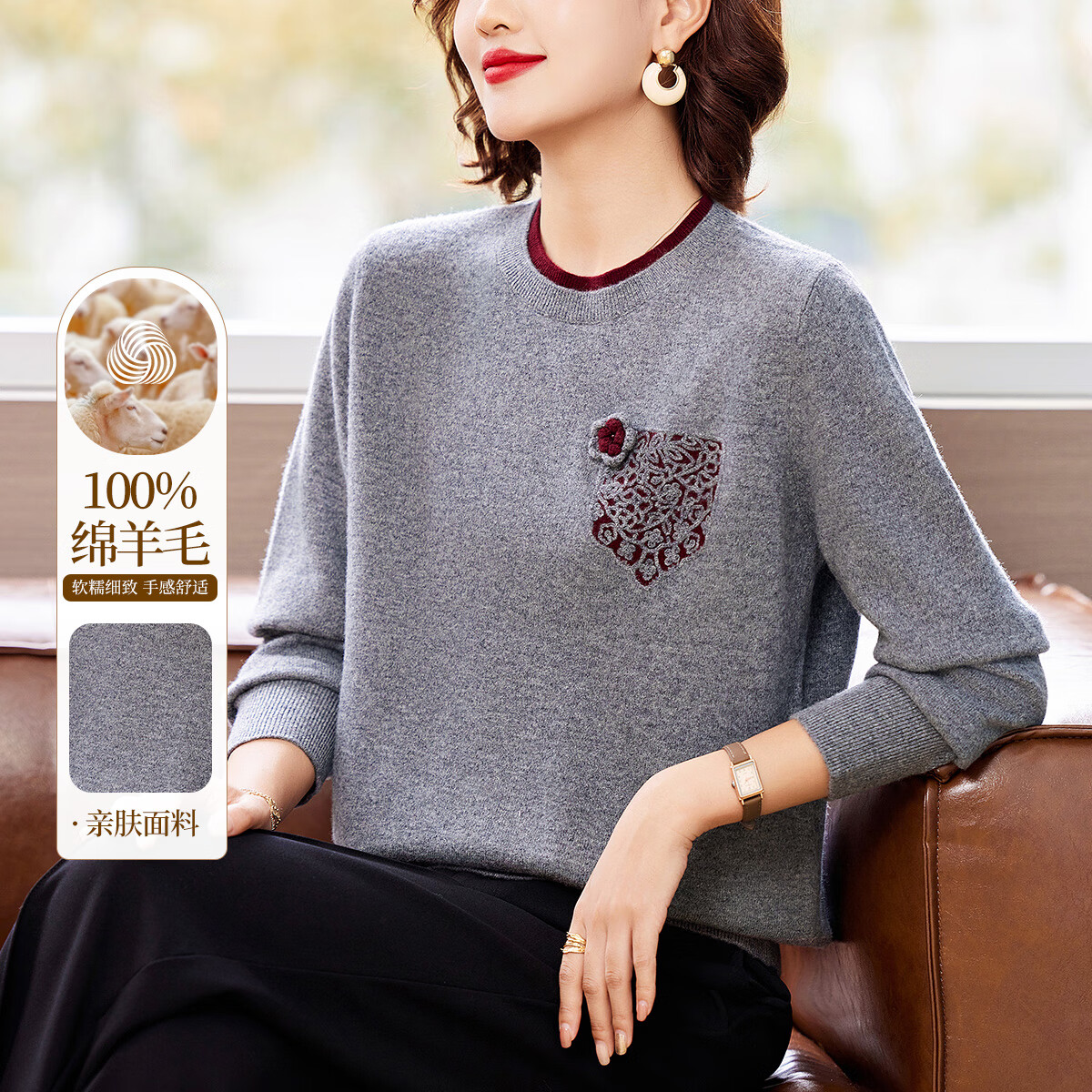 卡汶(KAVON)【100%绵羊毛】国风立体缕空绣花毛衣2025款高级感针织衫 灰色 XL