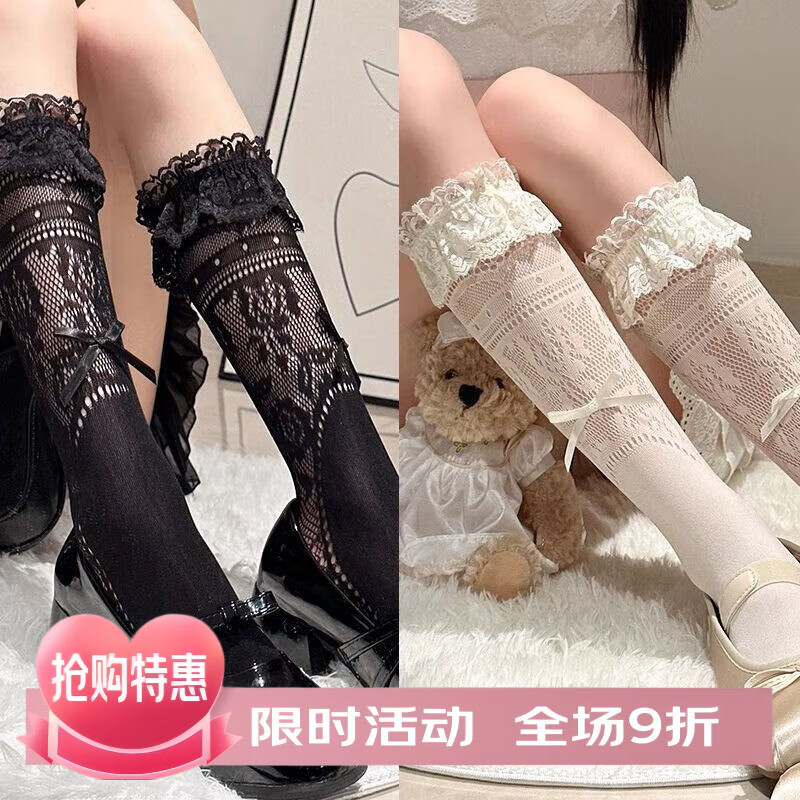 COMIC SOUL洛丽塔蕾丝花边蝴蝶结少女中筒袜子日系缕空芭蕾风小腿堆堆袜两穿 [lo娘必入]清冷黑+米白 均码 可以随意堆叠或者拉伸-长可
