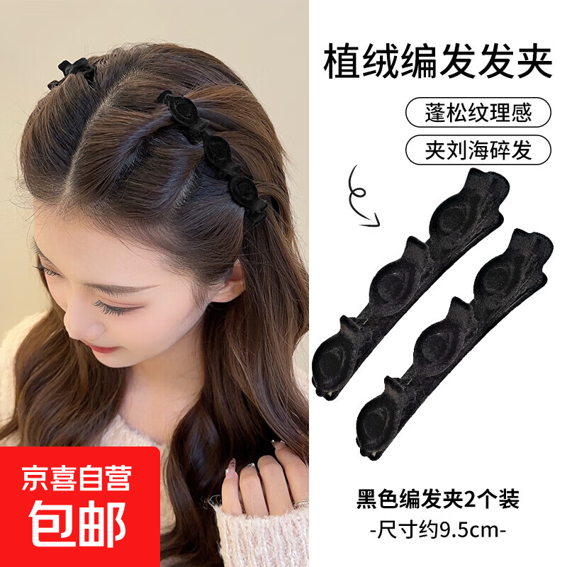 懒人植绒公主头编发发夹女前额碎发夹侧边纹理感刘海夹鸭嘴夹头饰 黑色绒面编发夹2个装