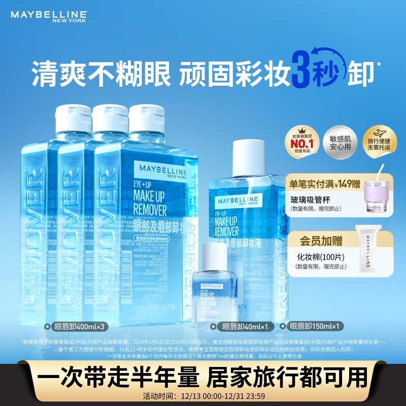 美宝莲(MAYBELLINE)眼唇卸1390ml套组(400ml*3+150*1+40*1)卸妆水深层清洁新年礼物