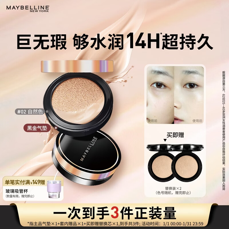 美宝莲超然无瑕黑金气垫BB遮瑕提亮含替换装02自然色 14g*2新年礼物女