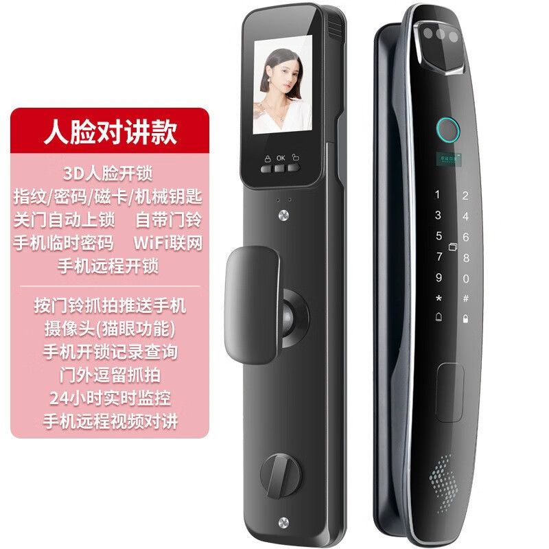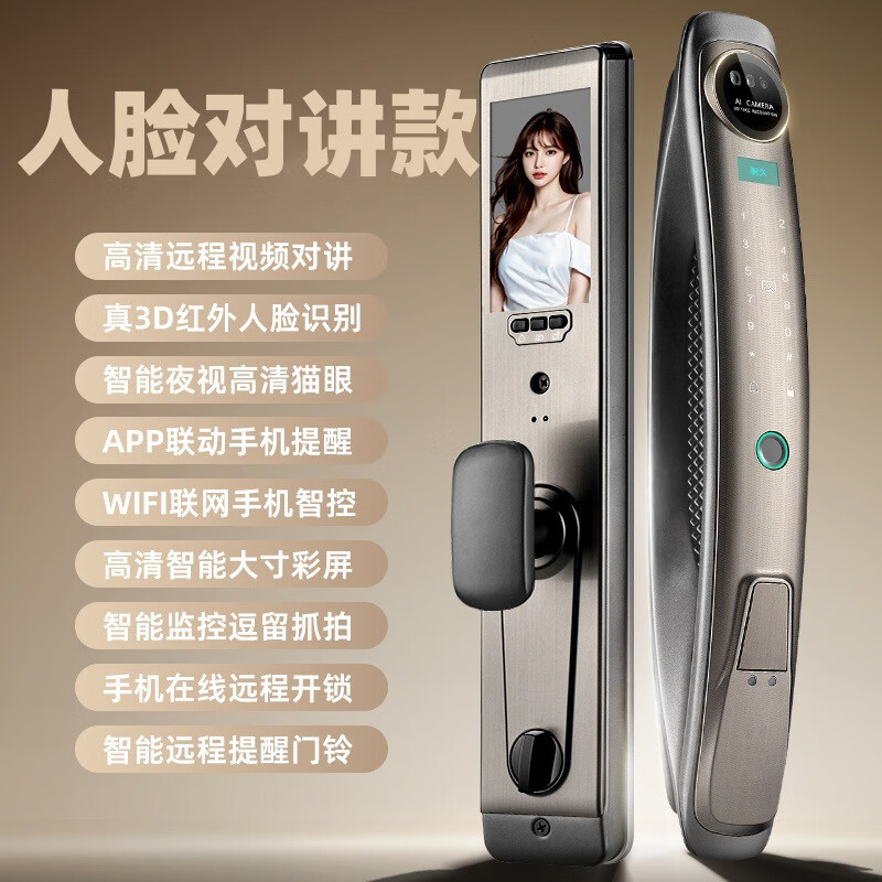 耐久3D人脸识别指纹锁全自动密码锁带钥匙远程密码智能门锁猫眼 CS7人脸对讲款