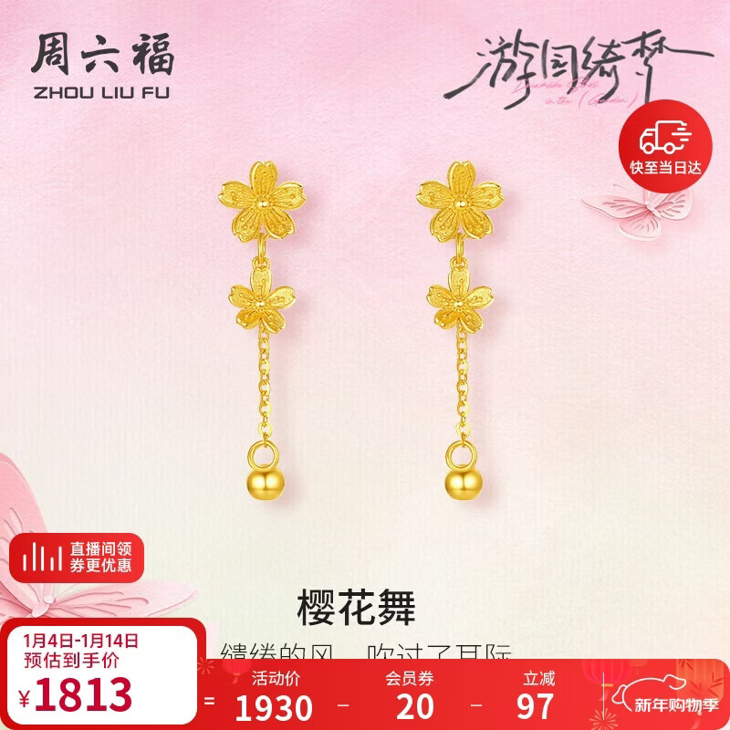 周六福樱花黄金耳坠女足金耳饰花朵生日礼物计价A0914959 一对 约1.36g