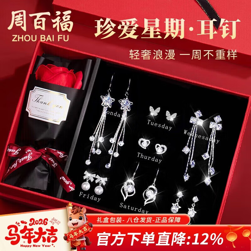 周百福 轻奢一周耳钉女银针耳环女款女耳坠生日新年礼物送女生