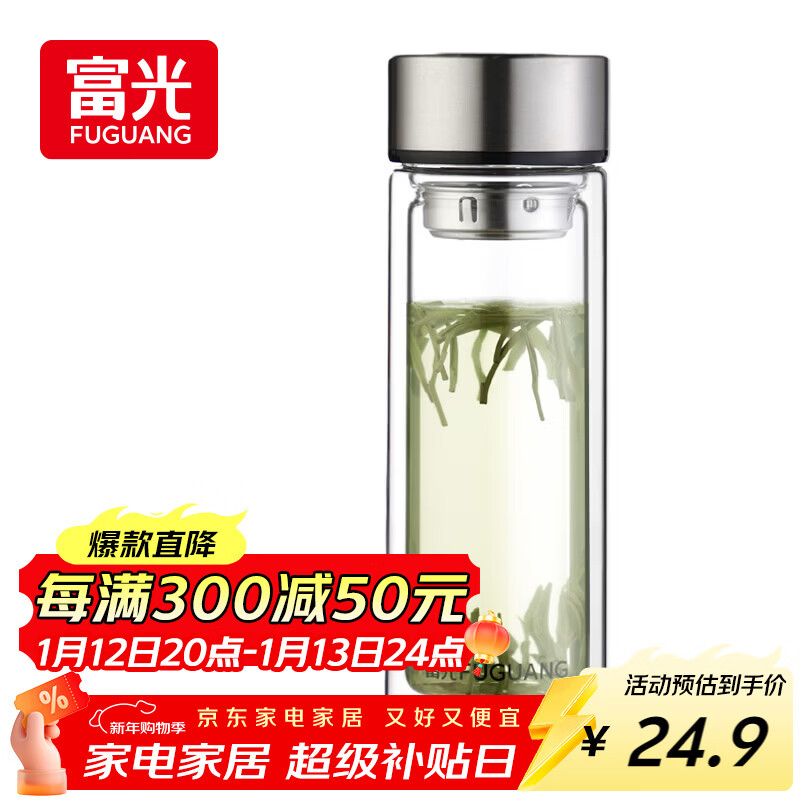 富光双层玻璃杯大容量带茶隔水杯高硼硅泡茶杯子商务男士办公杯320ml