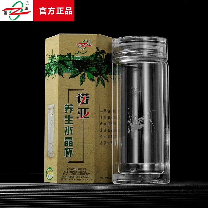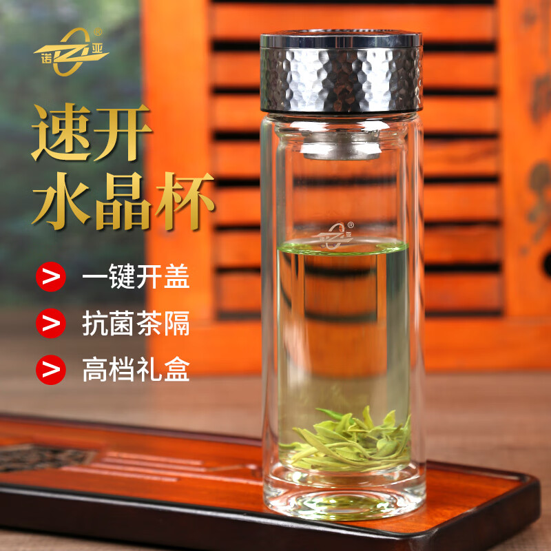 诺亚一键速开双层水晶玻璃杯商务办公泡茶杯男女士便携车载水杯礼盒装 一键速开水晶杯350ml银色